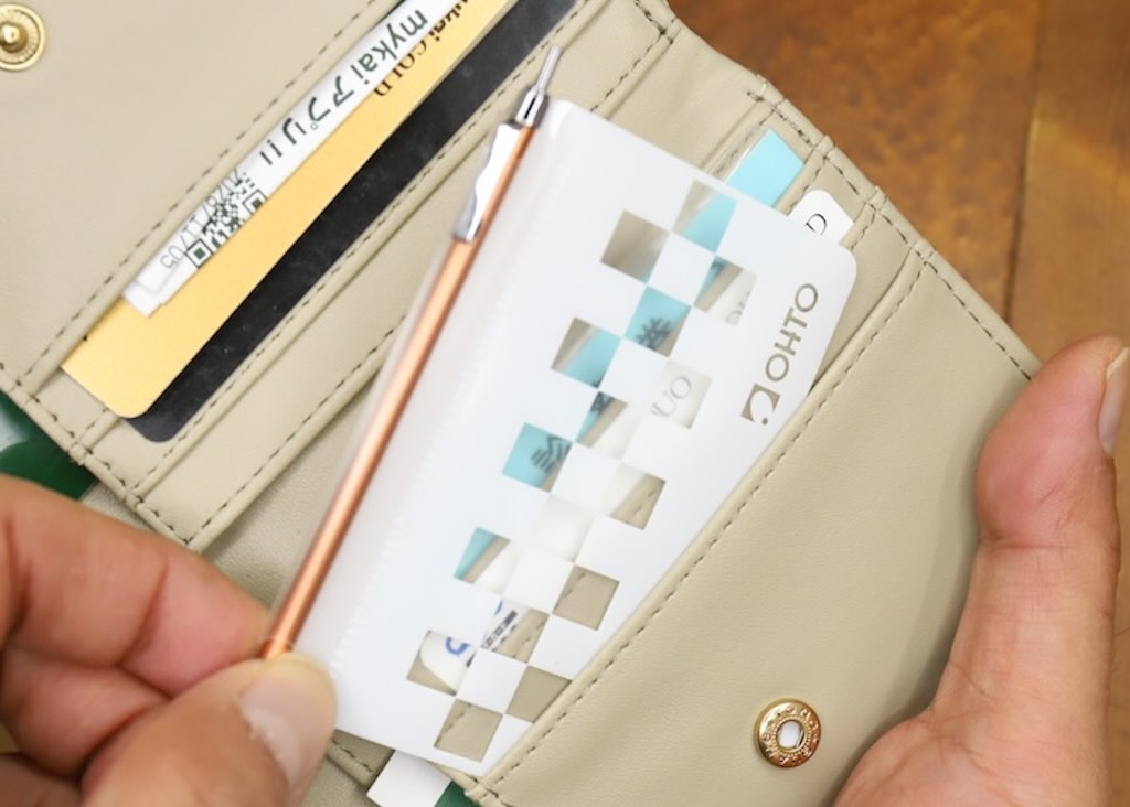 サイズも88×40mmと名刺よりひと回り以上小さく、当然、カードホルダーや名刺ポケットにもすっぽりと入ってしまう。カバー付き手帳の多くには名刺ポケットが付いているので、この時点で収納に困るということはなくなりそうだ。
