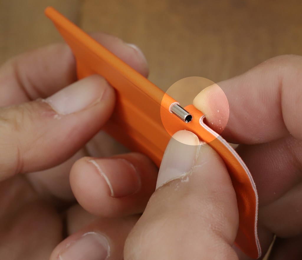 リフィルの交換は、まずホールの後端をふさいでいる合皮のタブを指で押してずらし、その間にリフィルを抜き取る。新しいリフィルの挿入はこの逆手順で行えばOKだ。