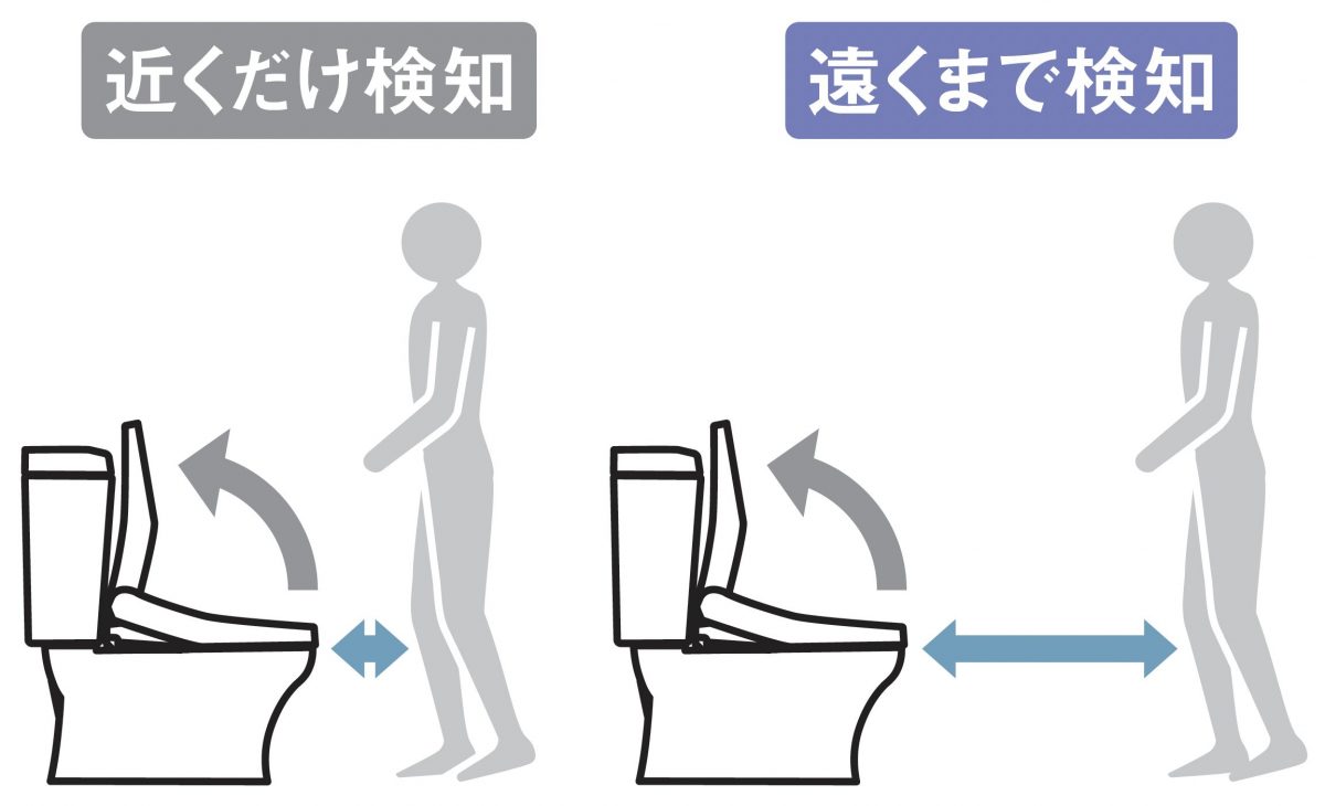 便器に近づくと便座ふたが自動で開き、離れると自動で閉じる。使用前後に便座や便器に触れる抵抗感から解放される。