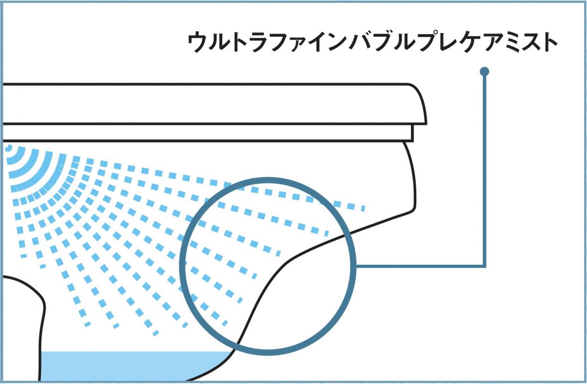 最大の特徴は、高い洗浄力をもつウルトラファインバブルを含んだ洗浄水が、便器や洗浄ノズルだけでなく、お尻を洗浄。ロータンク(洗浄水を貯めるタンク)の水垢抑制(※1)までトータルで効果を発揮する点だ。こまめに掃除をしなくても、いつも通り使うだけで便器やノズルを都度洗浄してくれる。さらに、1時間ごとにウルトラファインバブルを含むミストを自動噴射して便器内を洗浄するモードを使用すれば、尿のカルキ成分などによる汚れを軽減し、約2ヶ月間トイレの手間を軽減(*)(★1)。そのうえお湯を保温し続ける必要がない瞬間式なので、湯切れの心配がなく省エネ効果も優秀、とくれば、NEXTヒットは間違いない。これからの温水洗浄便座は、ウルトラファインバブルの洗浄力に注目だ!