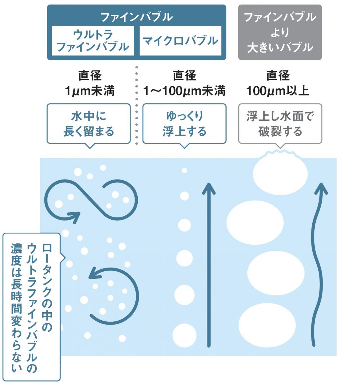 1μm未満の空気の泡。水に長時間溶け込む性質を持つ。マイナス帯電するので、プラスイオンを帯びた汚れの素に吸着してもろくし、泡の破裂と同時に除去する効果も併せ持つ。