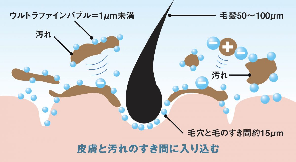 マイナスに帯電したウルトラファインバブルが、プラス帯電した汚れを吸着してはがす。その泡が破裂することで汚れが落ちる。