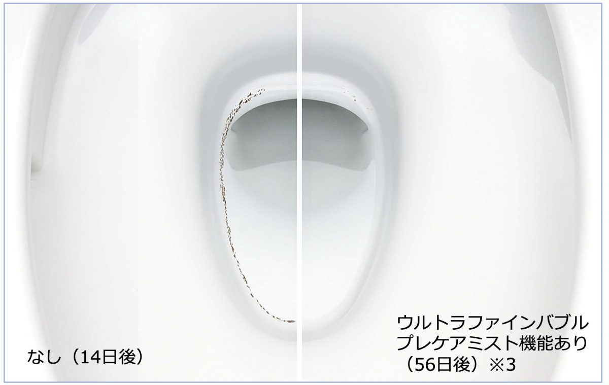 ★1:便器内の黒ずみ抑制及び除去について。[試験機関](株)衛生微生物研究センター。[試験方法]便器内喫水線近傍に付着させたカビの除去具合を確認。ウルトラファインバブルを含むプレケアミスト噴射による。[対象部分]便器内。[試験結果(実使用での実証結果ではありません)]カビの除去及び抑制具合に差が見られた。[試験番号]2023D-BT-02010