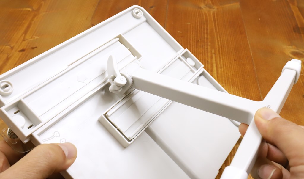 クリップ付き書見台を使う際は、まず背面のレバーをパチッと上げてロックを解除し、スタンドを好みの角度まで動かしたら、レバーを戻して再ロックする。