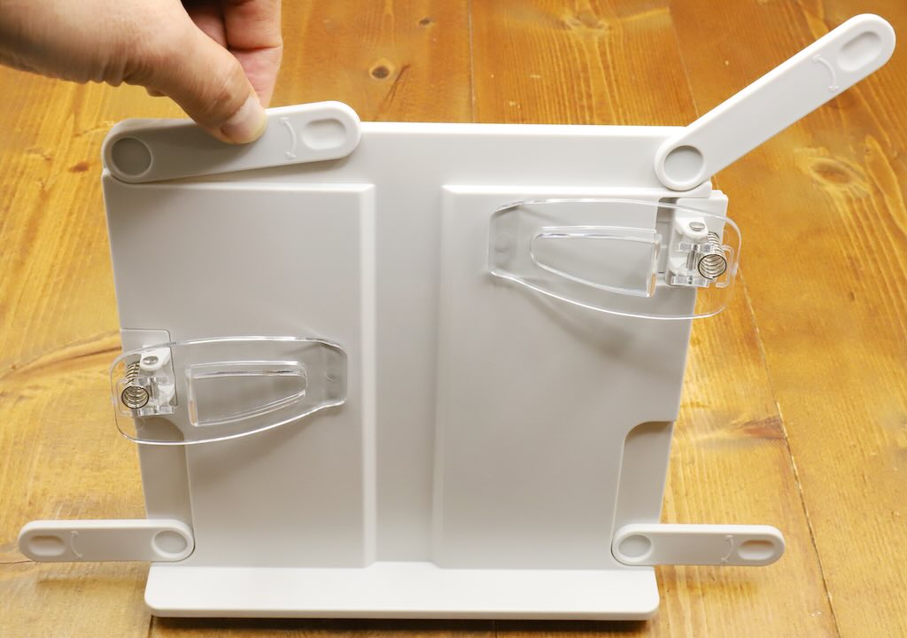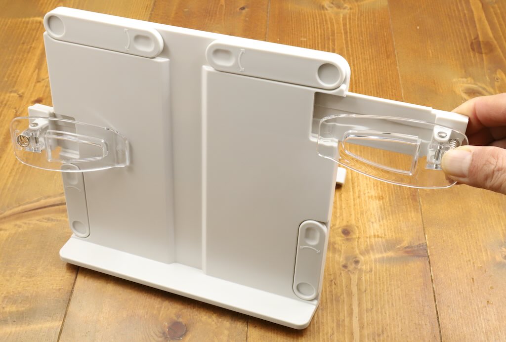 あとは書籍を開いて台に乗せるのだけど、このときポイントとなるのが、左右に備わったスライド式のブッククリップ。書籍の幅までスライドを引き出して、クリップでページ端を挟んで固定すれば準備完了となる。