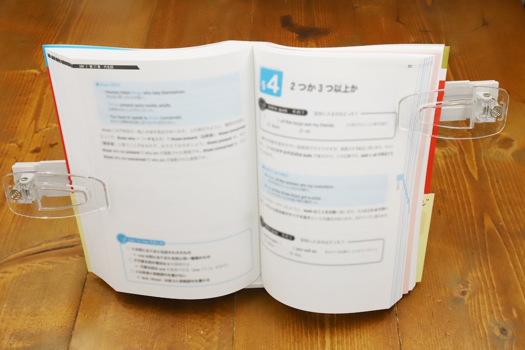 とはいえ、ページをめくる場合はいちいち左右のクリップを外してめくって、また挟んで……という作業が必要になるので、従来の書見台のようにページを頻繁に読み進める用途には向いていない。問題集や資料集の図説ページなど、ひとつの場所をずっと開いておく(=機能としてはブッククリップ寄り)ためのツールとして理解しておく必要はあるだろう。