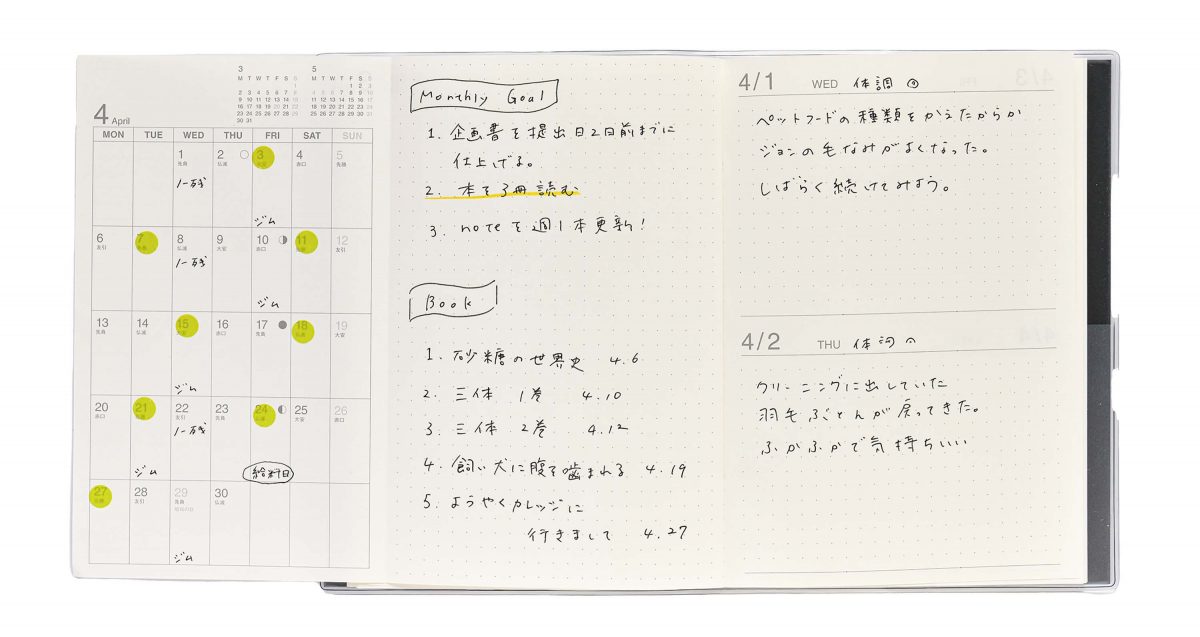 マンスリー、ウィークリーともにタテ・ヨコどちらの向きでも書き込め、予定やToDo、進捗管理など自在に使える。メモページが不足したときのために、別売りで同サイズのノート(1320円)もある。