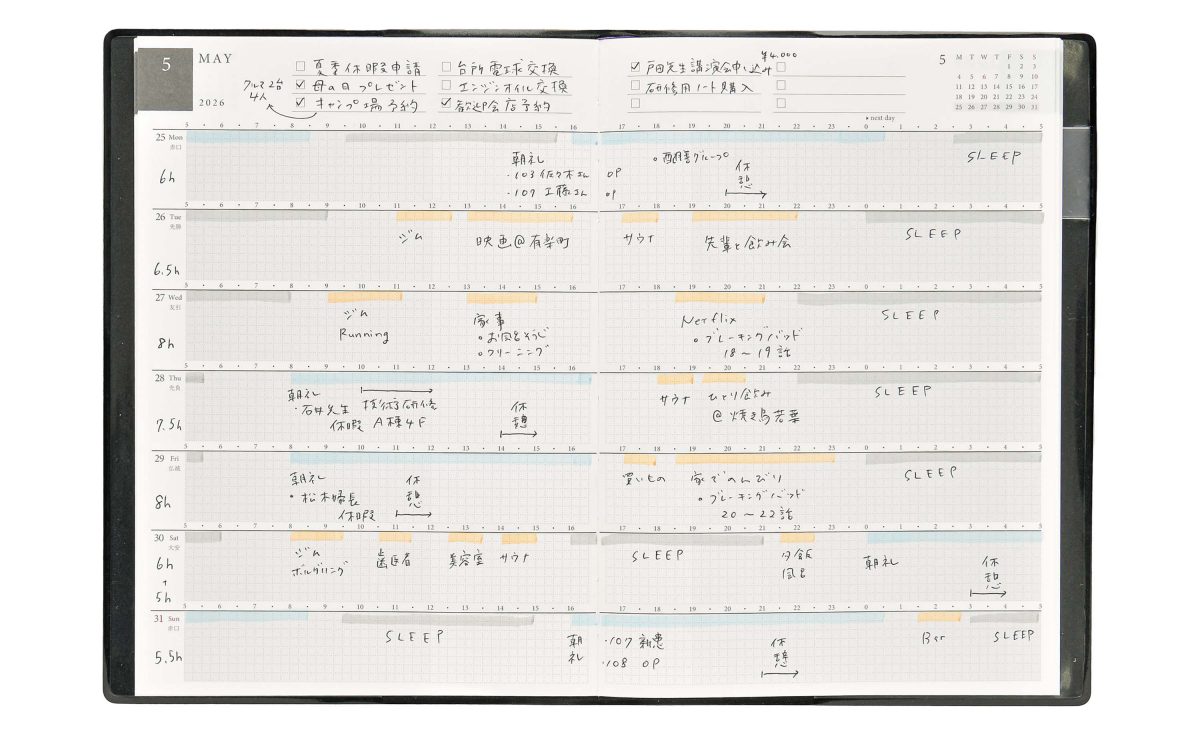 朝5時から翌朝5時までの“24時間ひと続き”のウィークリーを見開きで採用し、一般的な手帳では記録しづらかった「深夜」「早朝」にも対応。夜勤や深夜・早朝作業などの時間も可視化できる。