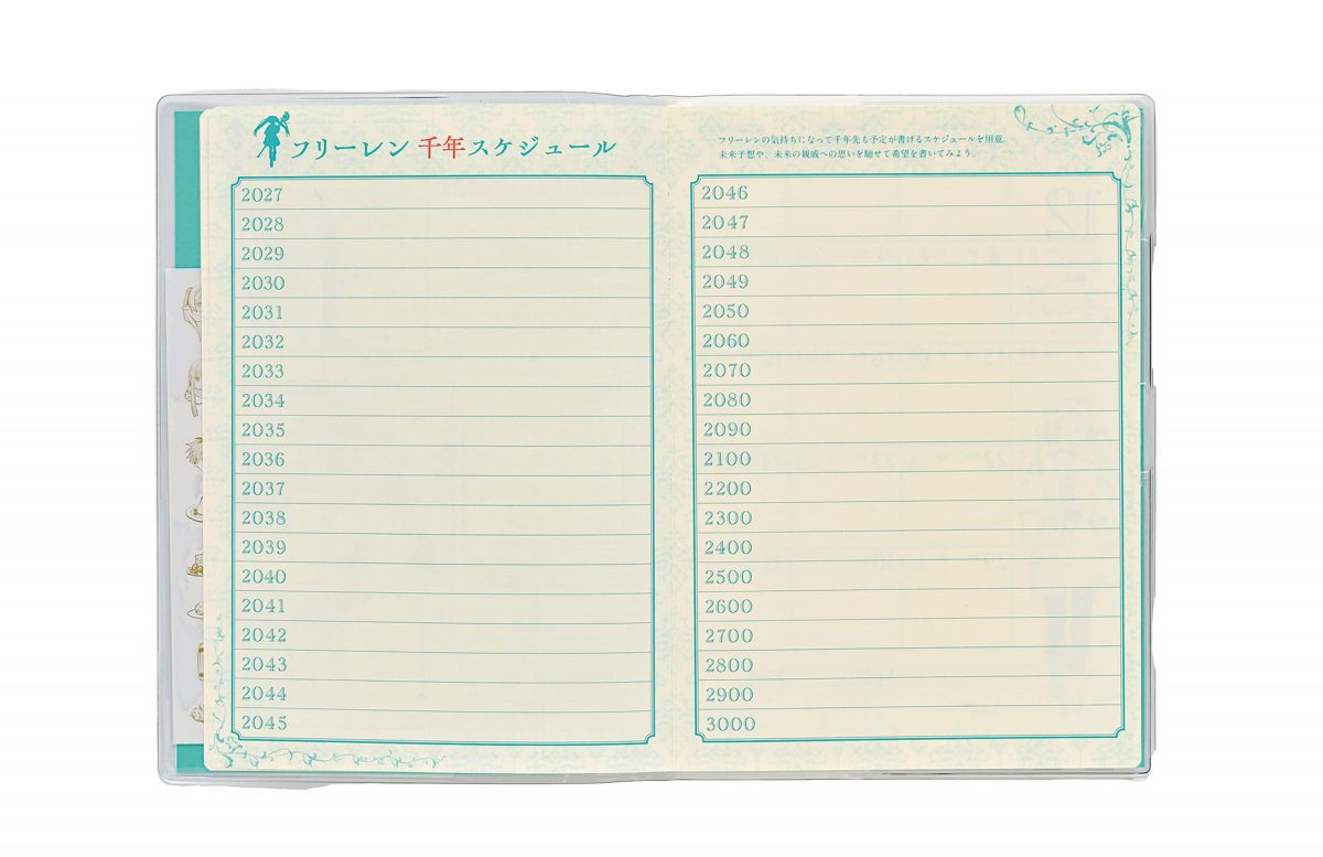 少年サンデーで連載中の漫画『葬送のフリーレン』の原作コマやイラストが散りばめられた一冊。主人公の種族であるエルフの寿命に合わせ、1000年先の予定まで書き込める。