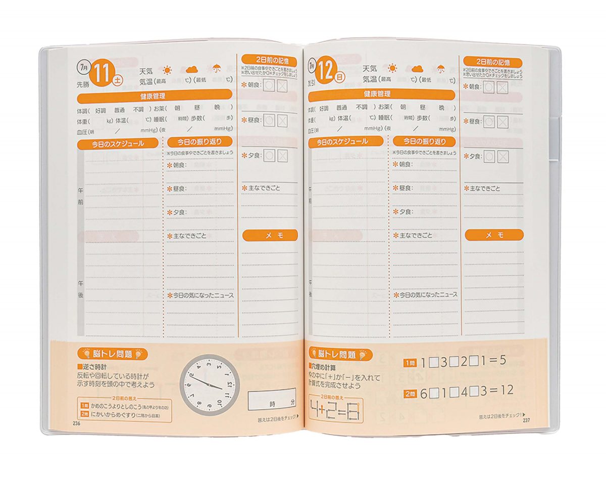 食事・行動・体調を記録し健康状態を確認することで長生きを目指す、これぞまさにライフ(寿命)ログ。「2日前の記憶」を書く欄や脳トレ問題も備え、ボケ予防にも役立つ。