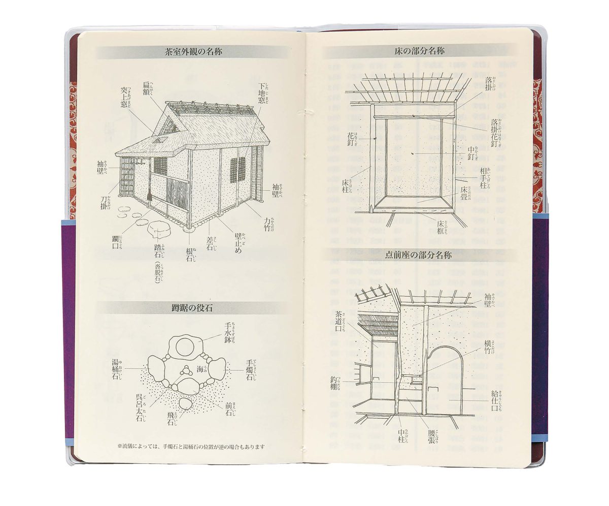 お茶会の記録と日々の予定を残せる手帳。茶道六家元の系譜や茶道具の名称、樂家歴代の窯印など情報も充実。茶道具を入れる「数寄屋袋」に入るサイズで、流派を問わず使える。