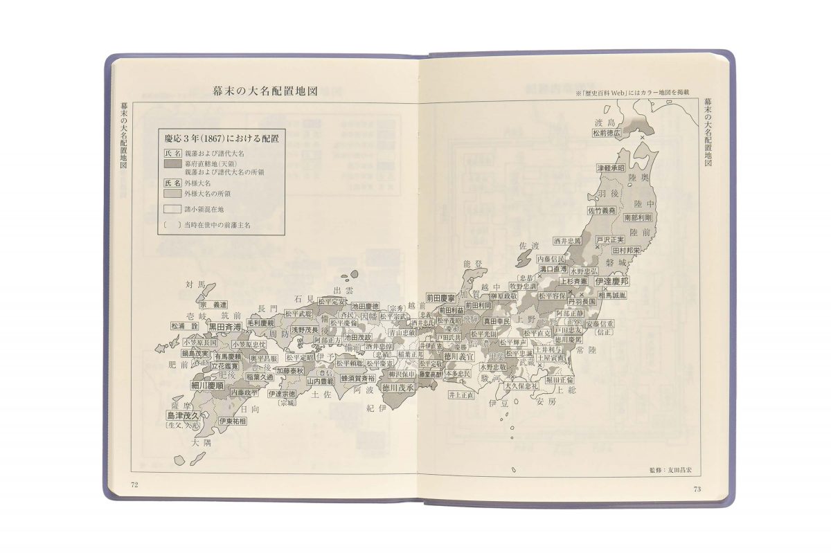 「応仁の乱の東西勢力図」、「太刀と刀剣」など、180ページもの読み応えある歴史百科を収録した、手帳兼資料集。来年は、次期大河の豊臣秀長を特集したページが付録となっている。