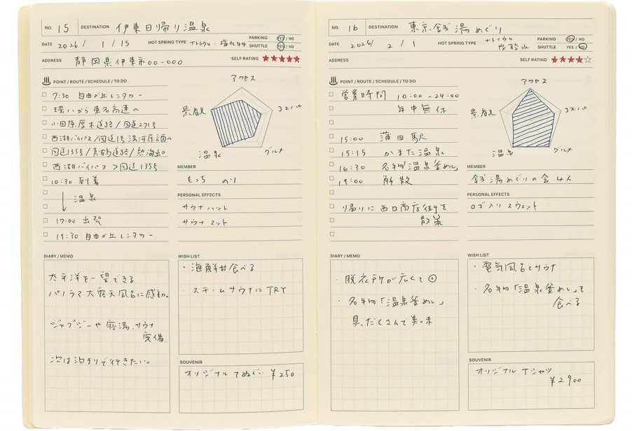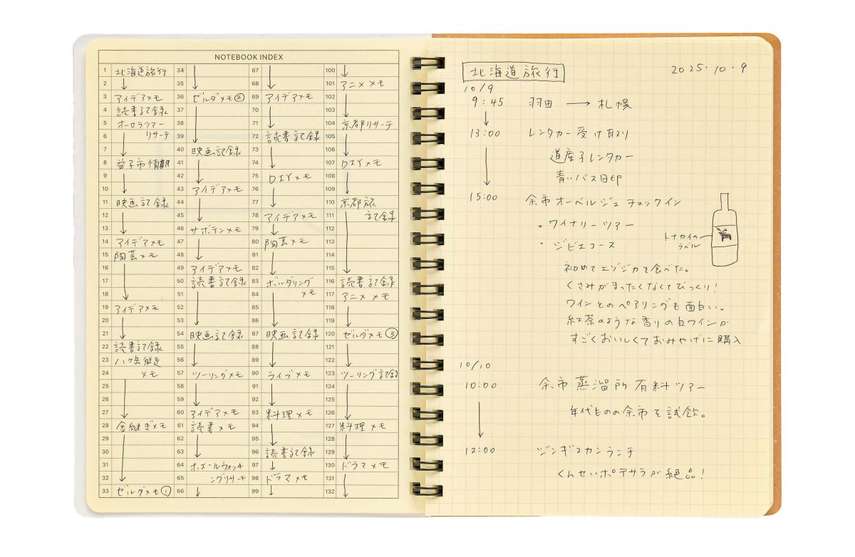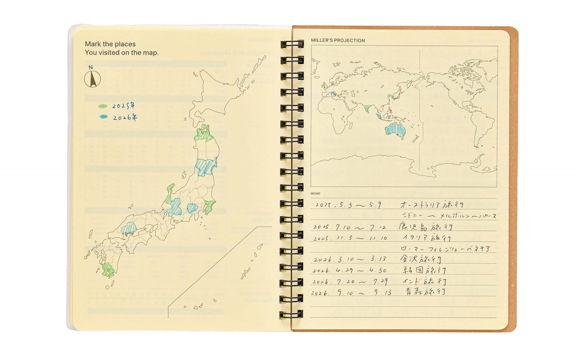 メインは、ノートとしても使える5㎜方眼ページで、紙面を広く使って記録を残せる。ウィッシュリスト(やりたいことリスト)や、見返しやすくするインデックス、白地図など、付録ページも充実。