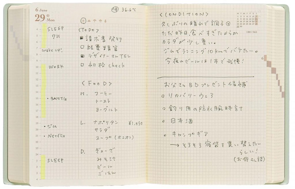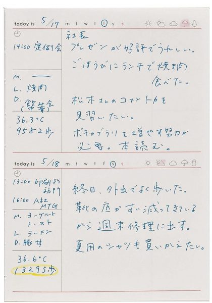 ここ数年、手帳ジャンルのなかでも特に注目を集めているのが、ライフログだ。ライフログは、未来の予定を書き留める手帳とは異なり、1日の行動からできごと、体調、その日の気持ちまで、現在と過去を記録することで、生活の履歴(ログ)を残すこと。1日の流れを文章化する必要のある日記とは異なり、やったこと、感じたことを端的に書くだけと、誰でも気軽にトライできて続けやすいところが、人気の理由だ。