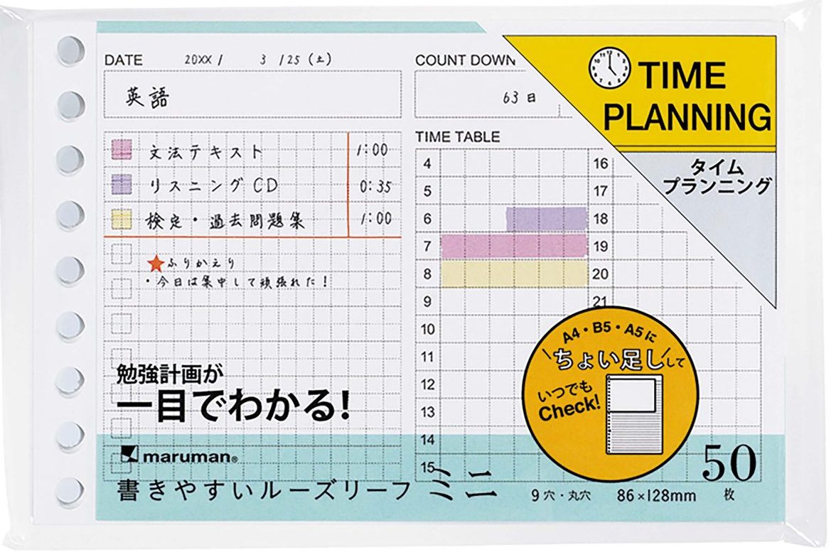 タスク管理や振り返りコメントなど自由な用途で使えるTo Do欄とタイムテーブルのみで、気軽に書きたい人向け。勉強用バインダーにちょい足しできる。