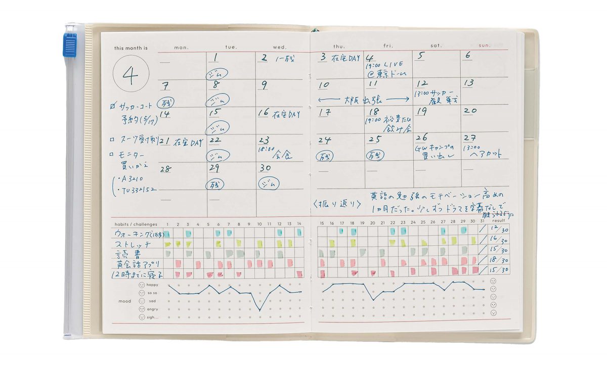 習慣化したいことを記録する「ハビットトラッカー」と、1ページに2日記入できる「ライフログ」を備えた手帳。お気に入りリストやレビューページなども収録。カバーはポーチになっている。