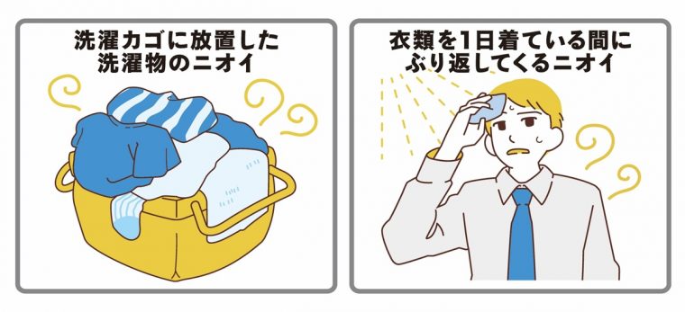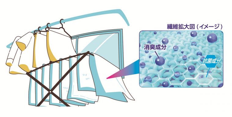 極小消臭成分と抗菌成分が繊維に吸着することで抗菌力を高め、生乾きが気になる洗濯物のニオイの発生を抑制。衣類についた汗臭・体臭・加齢臭・靴下臭も防ぎます。