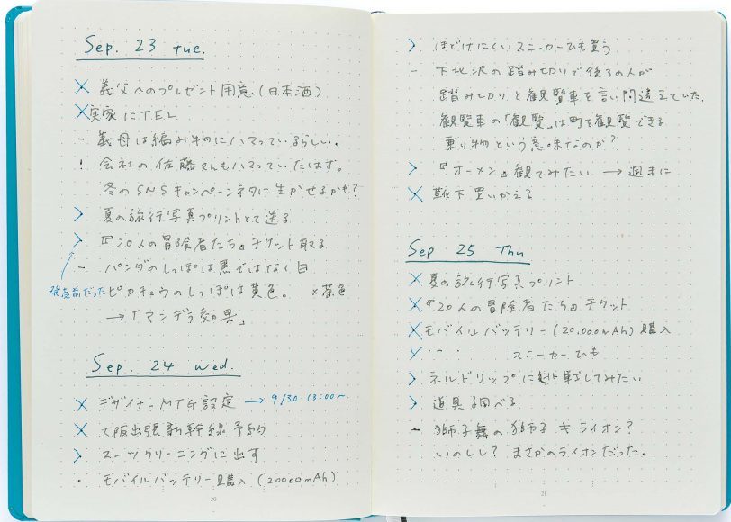 この手帳術のメインとなるページ。毎日その日の予定やタスク、アイデアなどを箇条書きにし、1日の終わりに書いた内容を振り返る。買い物や読書のメモなど、何を書いてもいい。