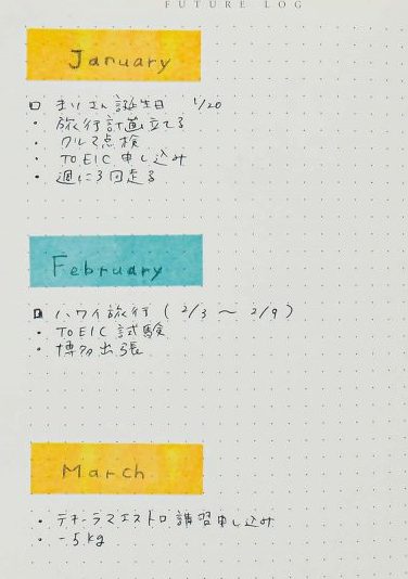 数ヶ月後の予定やタスク、やりたいことなどを記入するページ。ノートのサイズに合わせて見開きを4〜6等分し、月ごとに書き込む。
