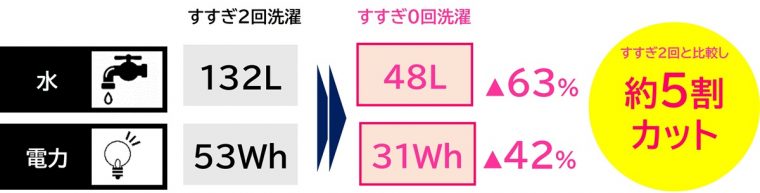 また、すすぎ2回洗濯時と比較して、水使用量・電力使用量を約5割削減することができます。すすぎ0回でも泡残りなく、洗剤残りの心配もないとしています(※)。