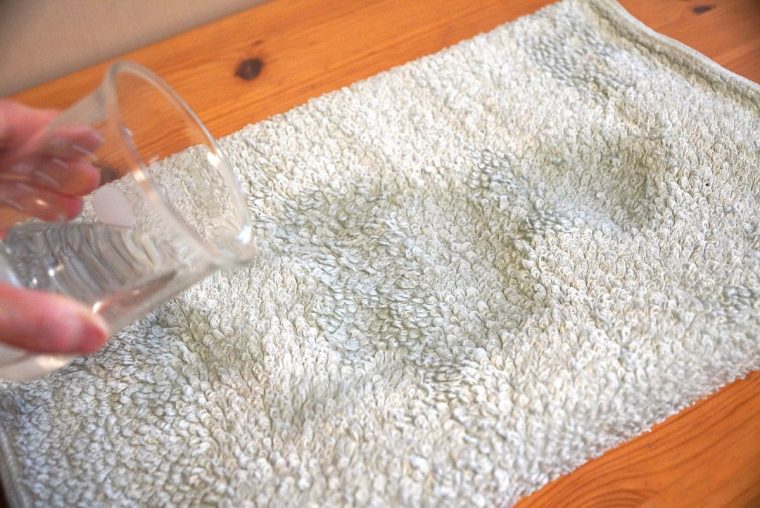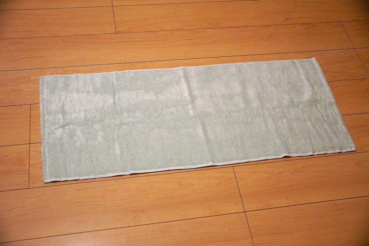 試しに、表面に100ccほどの水を垂らしてみましたが、土に水が吸い込まれるように即時に浸み込んでいきます。2つ折りを2回した状態にして浸透具合を確かめてみましたが、浸み込んでいたのは裏面まで。繊維内に水分がしっかりと保持されているのがわかりました。この保水性なら髪の量が多い人や長い人でもしっかりと水分を吸い取ってくれると思います。