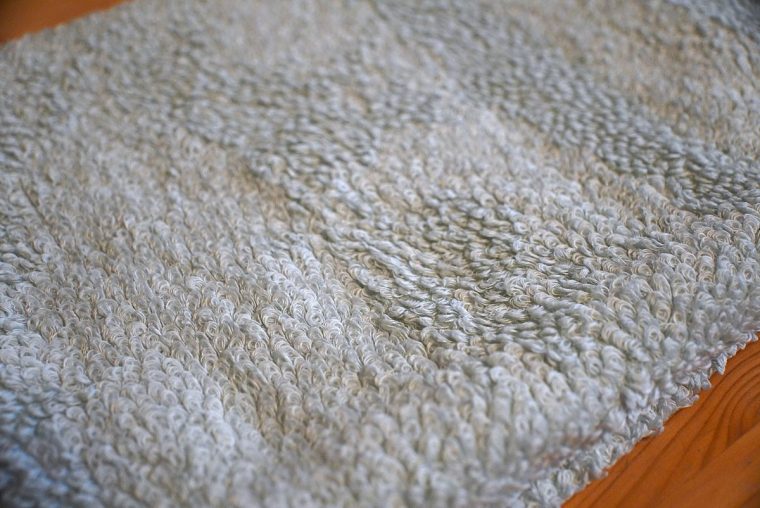 次に素材感ですが、一般的なタオルに比べるとパイルがかなり長めです。ずっと見ていると、トイプードルの毛や大仏様の螺髪をなんとなく彷彿させます。製品説明のとおり、太めで角がない繊維で、糸にねじれがないものの、ループが大きく取られた独特な形状のため、表面がフワフワしている印象です。