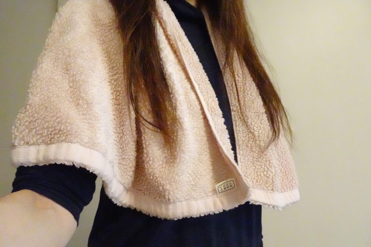 タオルのサイズは幅約100×長さ約40cm。一般的なサイズのフェイスタオルに比べると、縦横ともに少し大きめ。ヘアドライの際は、タオルを肩にかけたり、ターバンのように頭に巻きつけたりする人も少なくないと思いますが、フェイスタオルよりも少し大判のため、髪の長さによらず、タオルドライをしっかりと行うのに適正なサイズ感。“帯に短し襷に長し”な感じはせず、厚みや重量もちょうどよいため、頭に巻いて腰まで届く筆者の髪をまとめたときにも安定感があり、そのままでも動きやすいです。