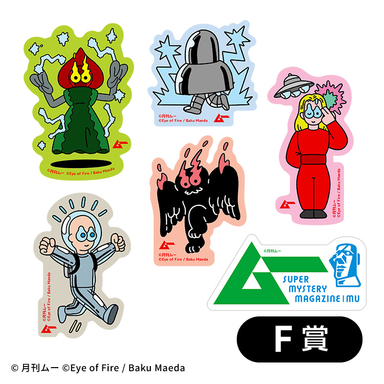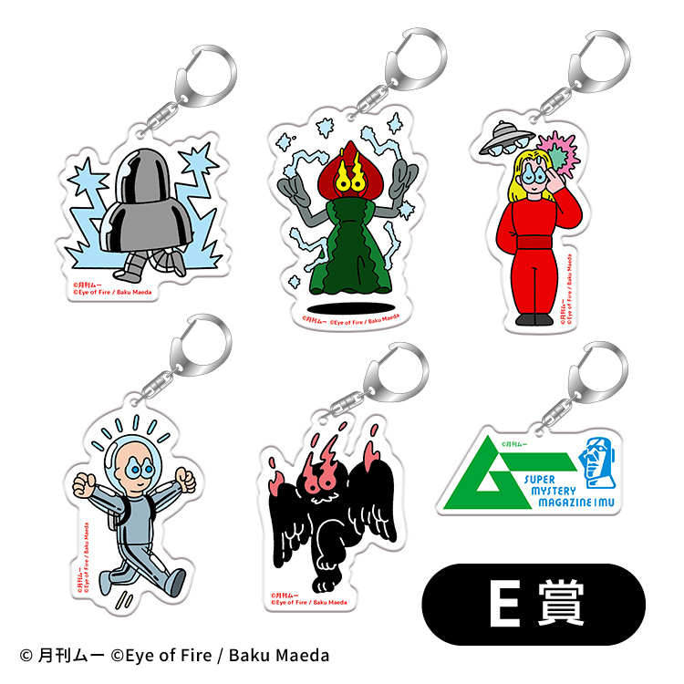 一番のレア賞品「A賞」はUMA ×エイリアン5体がそろったビッグアクリルスタンド(約200×300 mm)。瞳が燃えるところからおわかりのように、人気アーティスト・イラストレーターの前⽥⻨⽒の描き下ろしです。普通なら非常にあやしい面々がかわいくデザインされています。