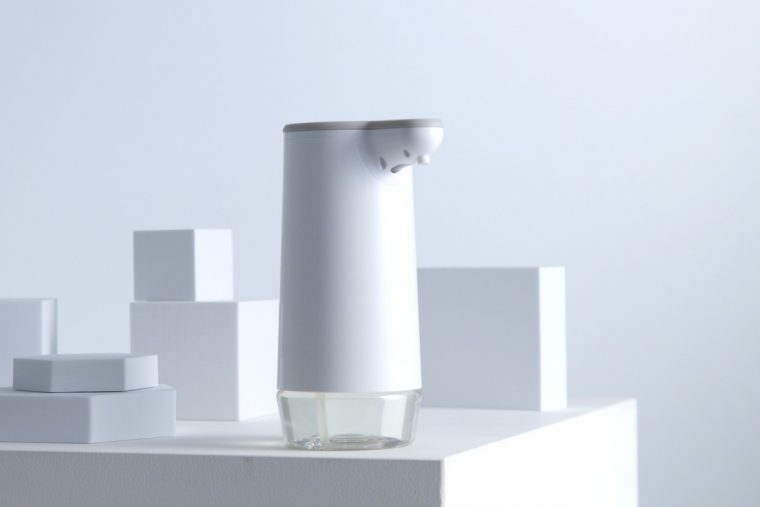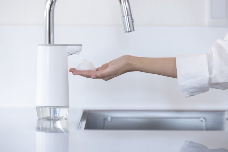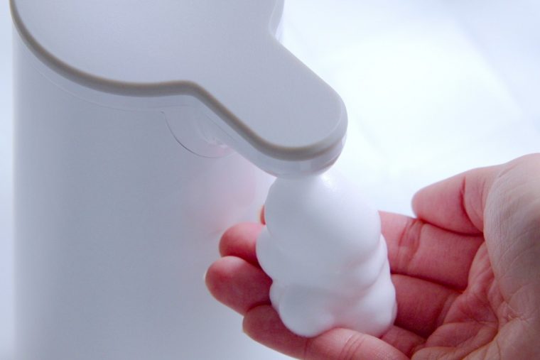 センサータイプのハンドソープディスペンサーは、自動で泡が出るので衛生的に使えます。本体は防水仕様で、丸ごと洗えるのも◎。