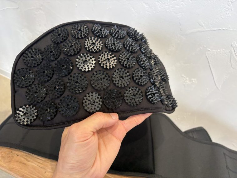2列に並んだミニスパイクが、こめかみや額まわりにほどよい刺激を与えます。面ファスナー仕様のため、自分の好みに合わせてフィット感を簡単に調整可能です。仕事の合間の気分転換にサッと巻ける手軽さが魅力となっています。