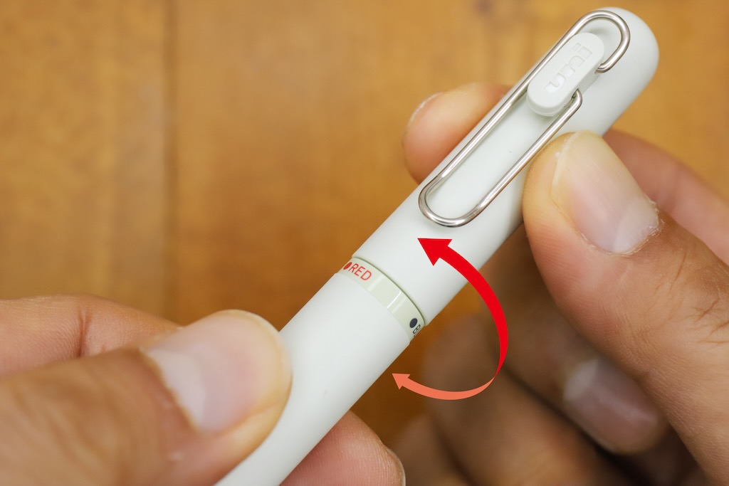 ただし、芯出しの方式はノックではなく、前軸をひねって芯色を選択するツイスト式。軸中央リングに印字された芯色をワイヤークリップ先端に合わせると、その色が出てくるようになっている。