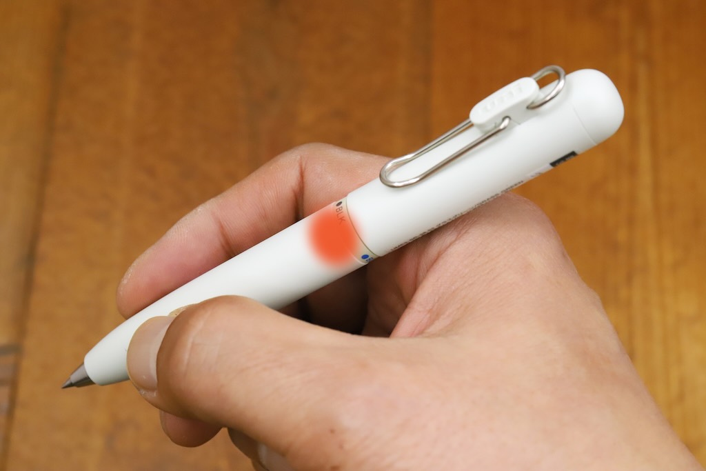 むしろ「ワンF」「ワンP」と同様の前軸スタビライザー(重り)が効いているので、書いていると先端に重みを感じるぐらいだ。多色ペンとしてはむしろ安定して書きやすいほうだと思う。