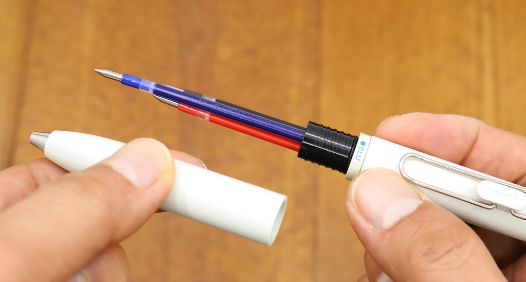 後軸が短いため、小指と薬指で前軸を握って固定+人差し指と親指で後軸をひねる“片手ツイスト”がやりやすく、色替え・芯出しの取り回しはむしろノックよりも手軽なぐらいだ。