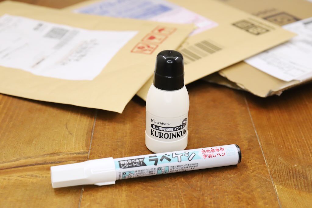 そこで、その辺りを少しでもラクにできないかと考えて、シヤチハタの感熱紙専用字消しペン「ラベケシ」と、個人情報保護インク「黒隠くん」を試してみた。