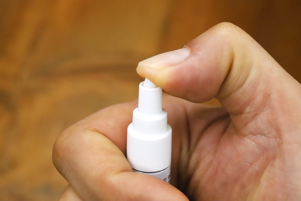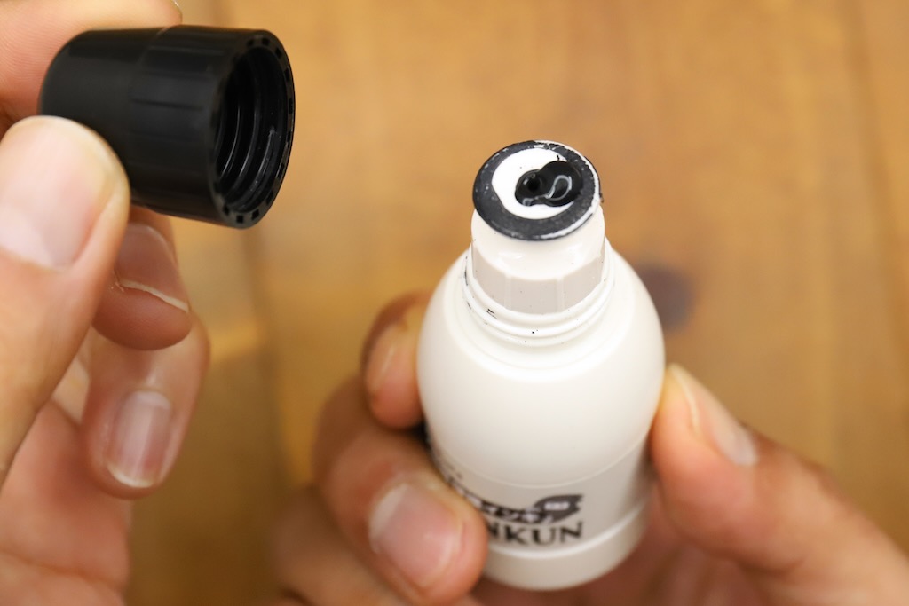 使うときは、まずよく振ってから上向きにしてキャップを外し、ボトルを軽く押してインクが広口ノズルから少しだけ盛り上がる程度に出す。