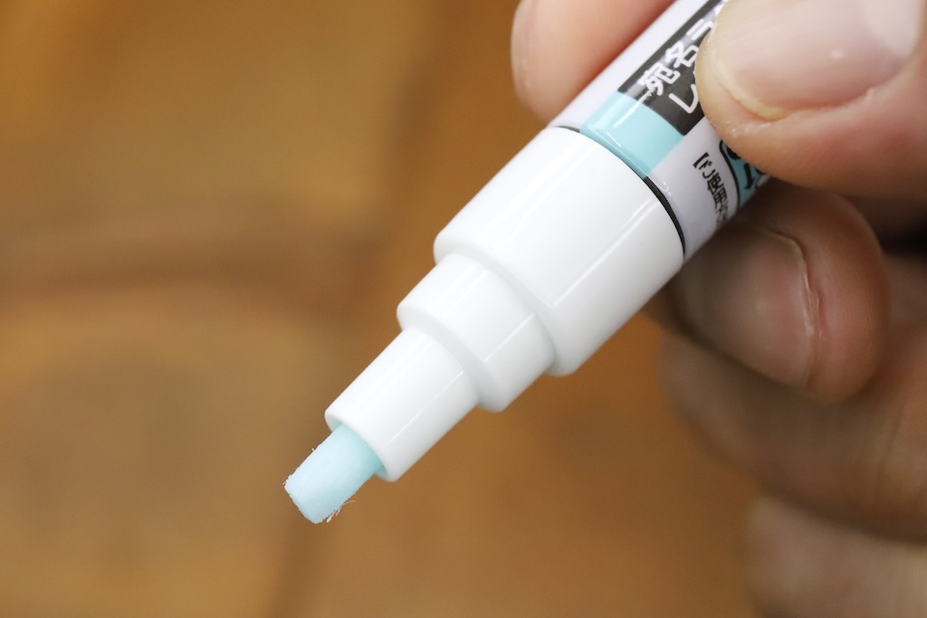 新品を使い始めるときは、まずキャップを開けて先端を上向きにし、ペン芯を親指でグッと押し込むようにプッシュし、中の空気を抜く。 続けて今度は下向きにして紙などにペン芯を押し付けて繰り返しプッシュ。だいたい30回ぐらいやると芯が水色にじんわり染まるので、これで準備完了だ。