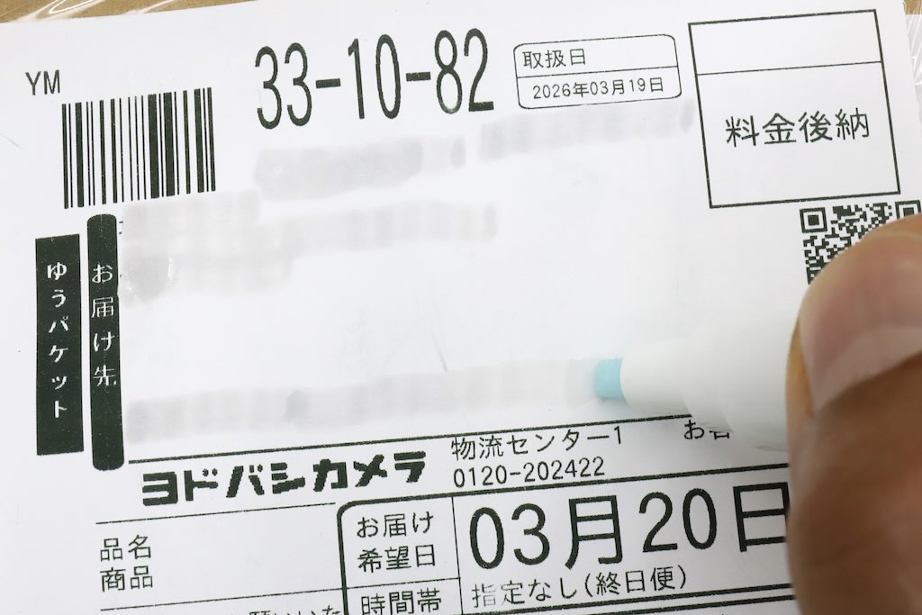 昨今、大手通販会社の宛名ラベルはほとんどが感熱紙になっている。専用の感熱紙に熱を加えて発色させたもので、ラベル表面を爪でシュッと擦ると摩擦熱で色が変わるので判断できるだろう。