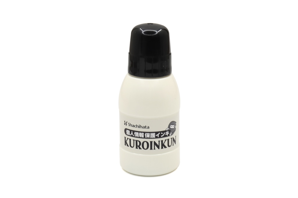 ラベケシとほぼ同時期に発売となった個人情報保護インク・黒隠(読み「こくいん」)くんは、ボトルに入った粘性の高い黒インクをラベルの消したい部分に塗りつけ、真っ黒に塗り潰すというもの。