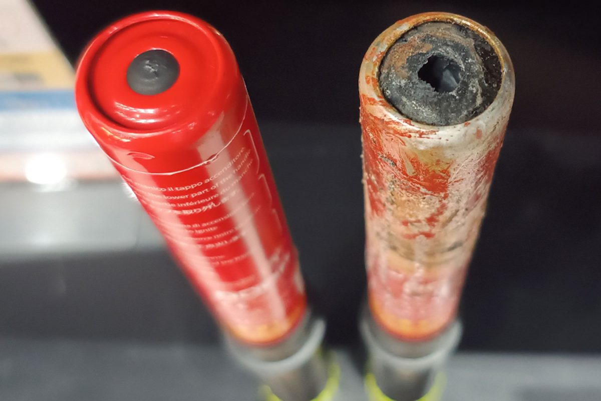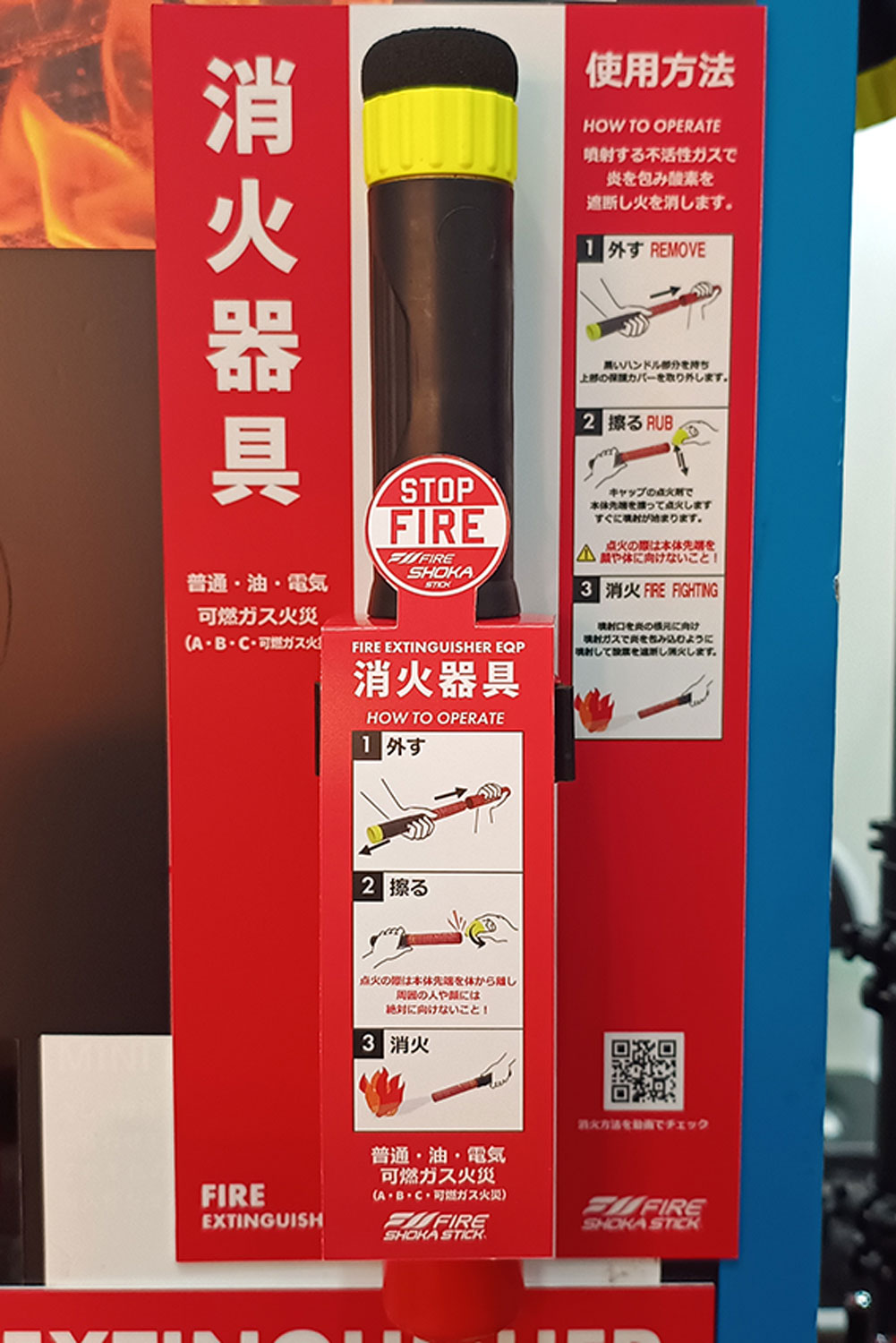 この製品はアルミ製のスティック形状を採用しており、本体の赤い保護カバーを外し、黄色いエンドキャップの先端と本体先端部を擦ることで本体内部の消火剤が化学反応して、不活性ガスが噴射される仕組みです。活性ガスが燃焼の連鎖反応を抑制することにより消火に作用するといいます。