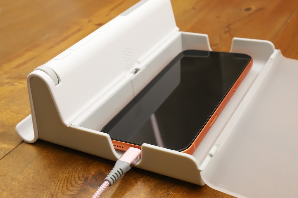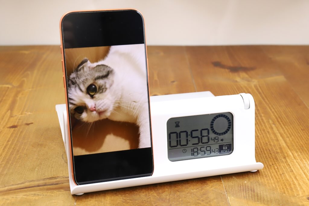 卓上用の学習タイマーとしても実用的だ。例えば、本体前面のトレー部にスマホを立てかけて動画を見つつ、「でも1時間後には見るのを止めて勉強しよう」といったスケジュール運用にもなかなか役に立つと思われる。