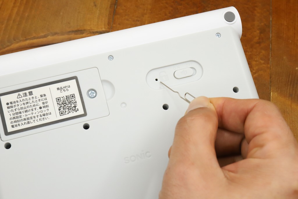 その方法は「ネジ止めの裏ブタを開けて電池を抜き差しする電源リセット」か、「裏面の緊急解除ボタンにリセットピン(ゼムクリップや安全ピンの先端など)を挿し込んで押す」の2つ。