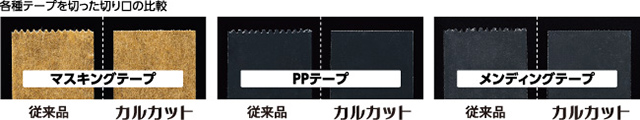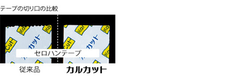 一方「カルカット」の特殊加工刃は、刃の山・谷すべてが「刃」になっているうえにテープに対して垂直にあたるよう取り付けられているため、軽い力で、テープの切り口がまっすぐになるのです。
