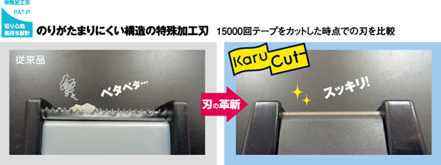 「カルカット」の最大の特徴は、まっすぐ切れるカッター部分。従来のテープカッターは、ギザギザ状の刃に押し付けるようにテープを裂いていたので、切る力が重く感じられていました。