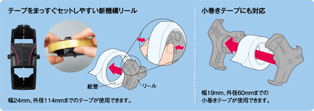 さらにリール部分にも工夫がほどこされており、大小どちらのサイズのテープでもカッターに装着できるようになっています。