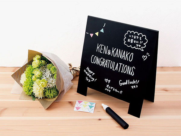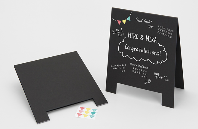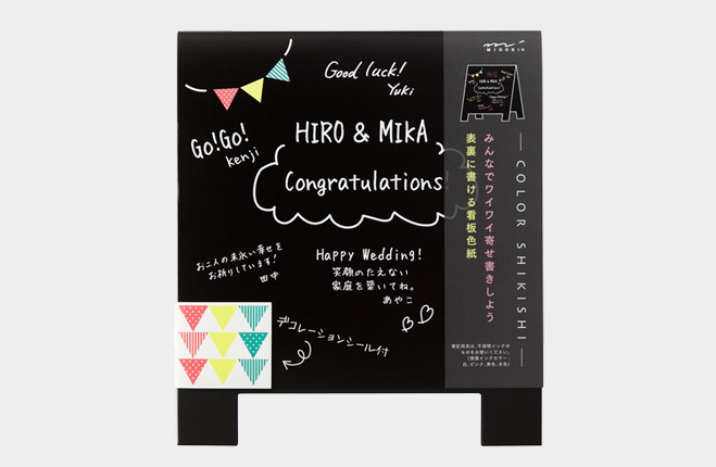この「サインボード形色紙」は、まるでカフェの看板のように立てられるようになっています。書き込むスペースも色紙としては珍しい黒地なので文字が引き立ち、ぐっとおしゃれな印象。