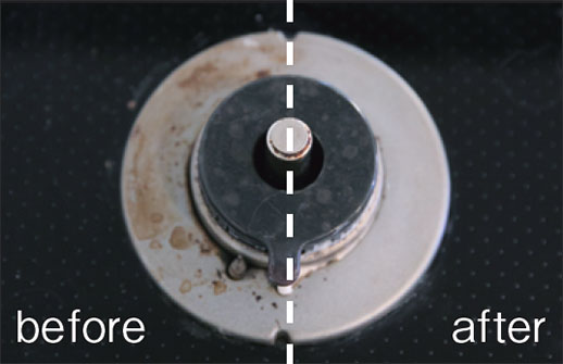 人工ダイヤモンドを鏡・ガラス用に独自技術で特殊加工した高機能研磨材。浴室の鏡にこびりついた頑固な水あかを、表面を傷つけることなく、水をつけてこするだけでキレイに落とします。