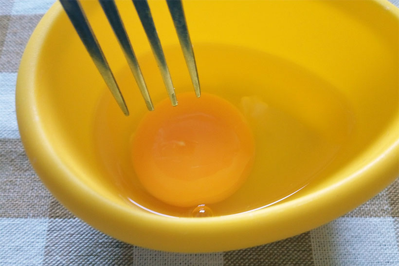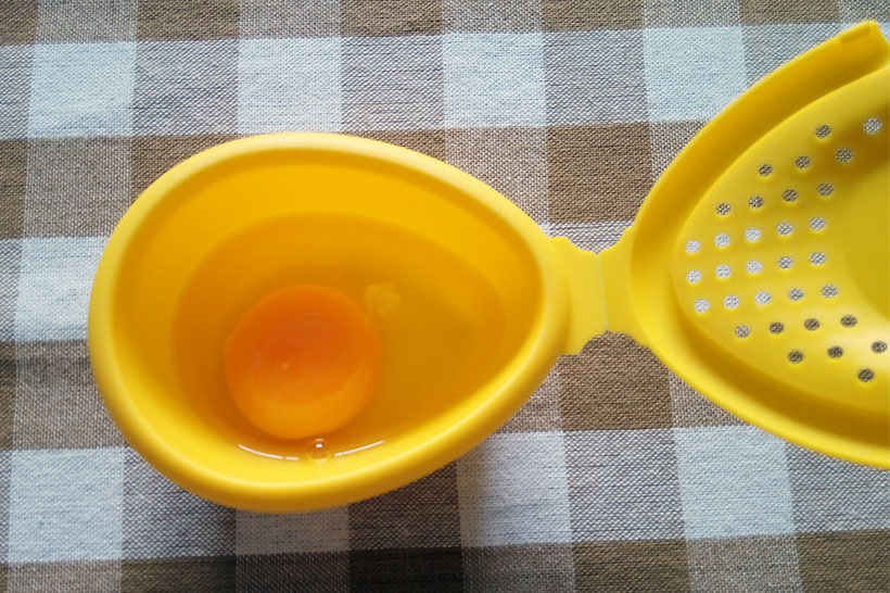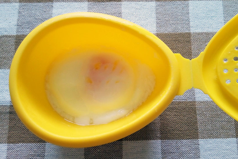 使い方は簡単。まずフタを開けてたまごを1個割って入れます。そのあと黄身の爆発を防ぐため、フォークで黄身に穴を開け、あとは大さじ3杯ほどの少量のお水を入れてフタを閉めれば準備完了。