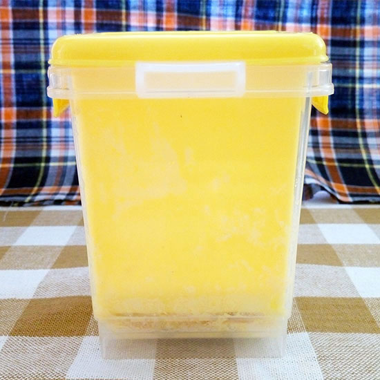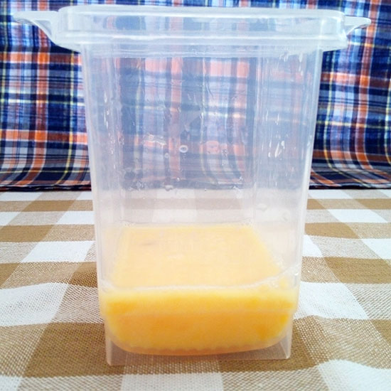 透明の四角い容器にたまごを1個割り入れて、大さじ1杯の水を足し、よくかき混ぜたあとに500Wで40秒レンチン。そこに砂糖と粉だしをお好みで入れて再びかき混ぜて、さらに40秒温めます。レンジから取り出したら、付属の黄色い容器を上からギューッとかぶせて1分待つと完成です!