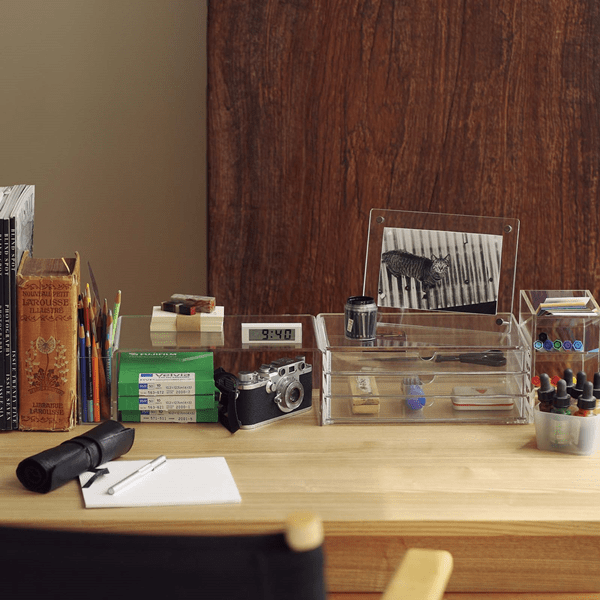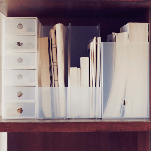 手紙や請求書など紙の整理に便利な収納ボックス。軽くて耐久性にすぐれたファイバーボードで作られています。クールな見た目で男性に人気。