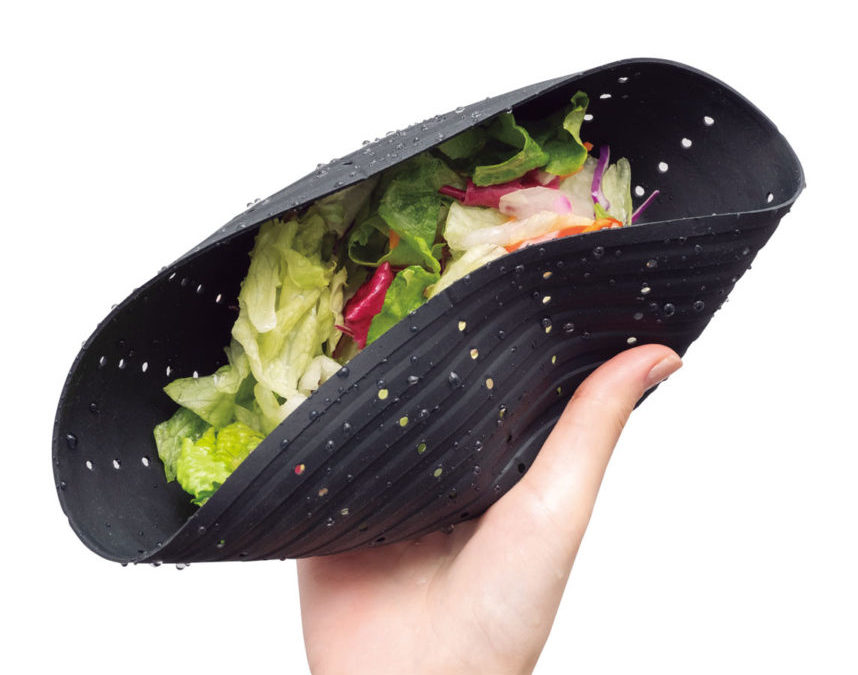 くたっと柔らかいシリコン製のザルは、手で握るだけで野菜の水切りや絞りを簡単に行える。耐熱温度が高く、電子レンジにも対応。直径は約18㎝で手に持ちやすいサイズだ。フタ開け時の滑り止めにも活用できる。